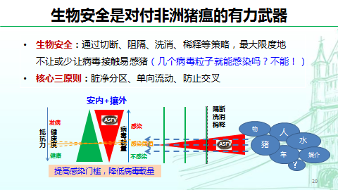 45、强调生物安全,对所有的传染病都有作用。生物安全不是让一个病毒都不进来,没有这个可能,病毒的量达不到感染的程度是不会发病的。生物安全的目的是让病毒尽可能的不进去或少进去,采用逐级稀释的方法,提高猪的非特异性免疫力,即使进去也不能让它感染。如我们在做攻毒实验时,通过采食吃进去104TCID50才能感染,肌肉注射102TCID50才感染,不是猪碰到病毒就被感染;