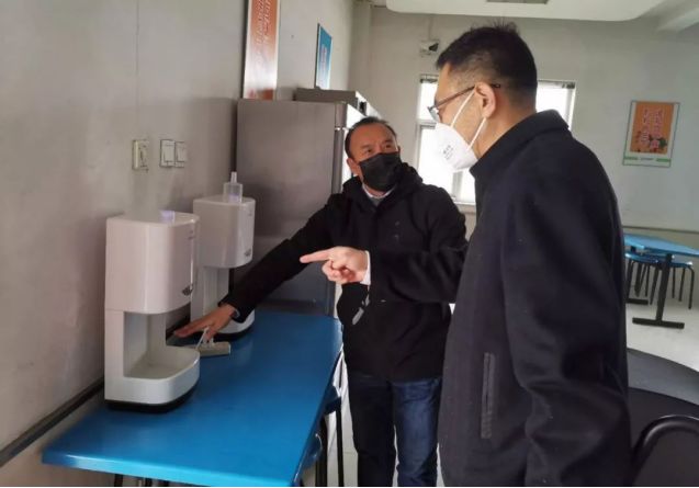 在巡视食堂时,都县长详细了解了员工食宿情况,给出消毒建议,指导防控细节。