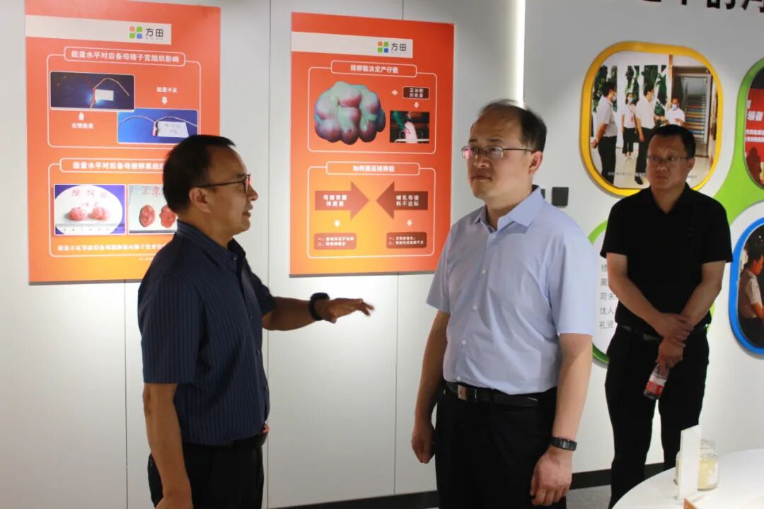 陈书记一行先后参观了生产车间、化验室、体验室。董事长付学平对方田发展历程、生产规模、经营现状、未来发展方向等做了汇报。