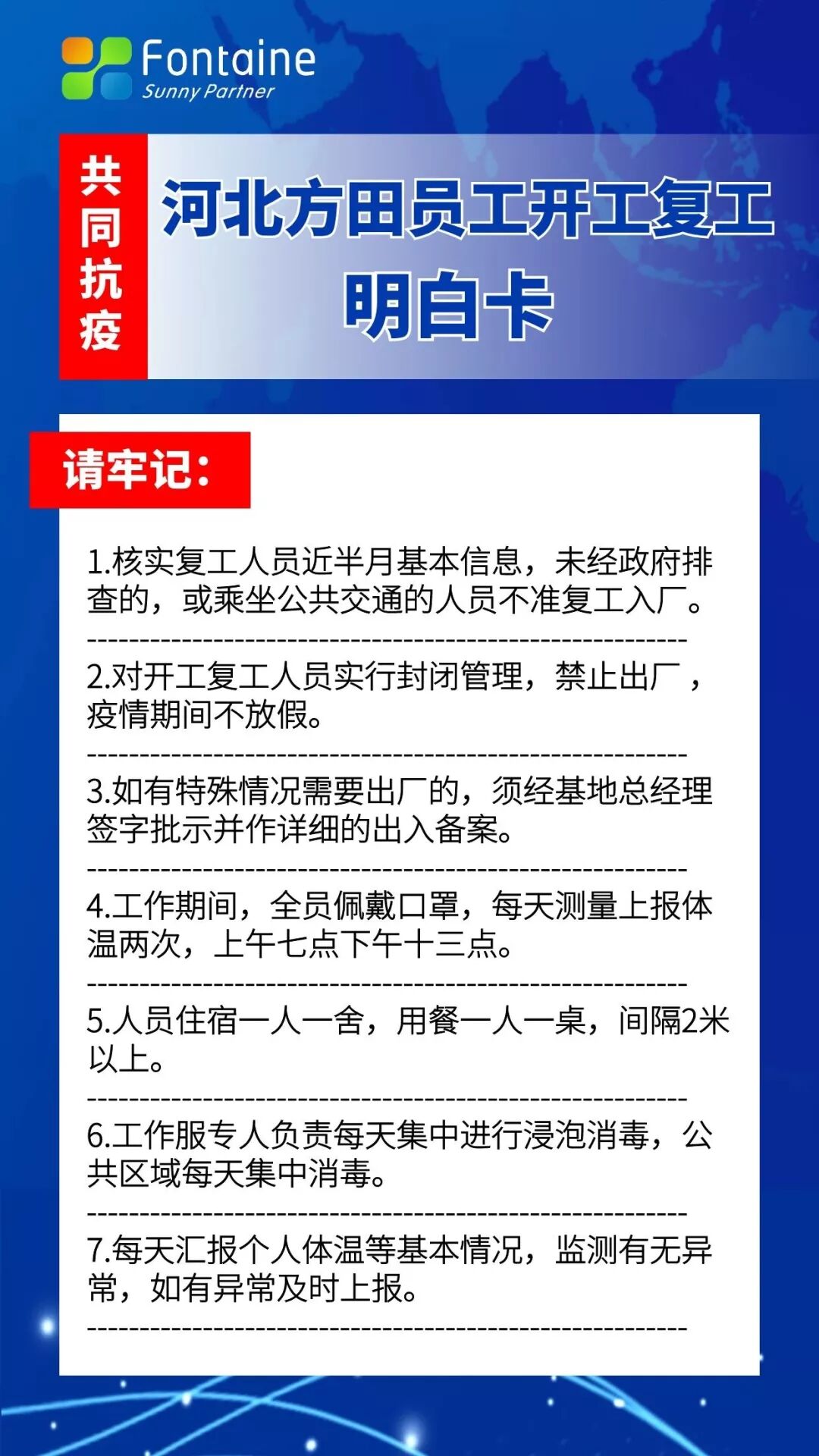 2月20日下午,保定市政府副市长曹海波,市政府副秘书长付建彬,市政府综合五处处长李斌,市工信局总调度长刘祁等一行莅临方田科技园调研复工复产与“新冠”肺炎疫情防控工作。蠡县县长都建华,副县长许涛,经济开发区党工委副书记、管委会副主任杜殿海,工信局局长展立军,经济开发区党工委副书记、管委会副主任付会斌等一行陪同考察。 曹市长详细调研了河北方田开工复工情况,了解疫情防控落实工作。在付学平总经理的陪同下,曹市长一行体验测温、登记、消毒等防控流程。 都建华县长向曹市长汇报了蠡县六类企业的开工复工情况和疫情防控工作进展。曹市长对蠡县至今未发现一例确诊或疑似病例表示满意,并强调:县各级部门要带头深入企业,检查防控措施是否落实,了解企业复工复产难题,帮助企业渡过难关,坚持疫情防控和复工复产两手抓,夺取疫情防控和经济社会发展双胜利。 随后,付总细致介绍了方田在蠡县政府与开发区管委会的指导和推动下,于2月10日顺利实现了开工复工,保障饲料正常供应。 曹市长听完汇报后,对方田疫情防控工作表示满意,给予肯定。曹市长强调要强化疫情防控宣传,提高员工防控意识,特别在员工工餐住行方面防控到位,并对企业复产遇到的困难给予关怀。